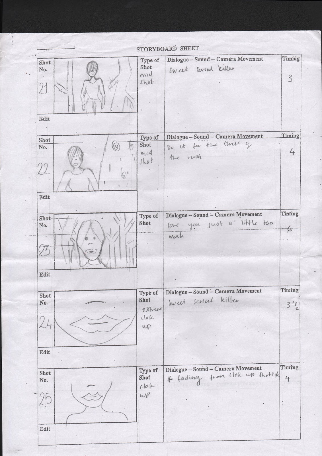 This is a film of the series shot i drew on my storyboard, although not being a 'artist as such' (as you can see through the images) this is a rough outline of the different shots I will be doing during shooting my video.